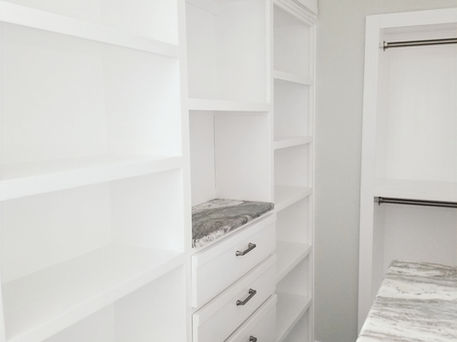 This custom remodeled closet features sleek white built-ins, ample shelving, and modern hardware for a clean, organized look. A leathered granite countertop on the island adds a touch of elegance, combining style and functionality in this beautifully finished space.